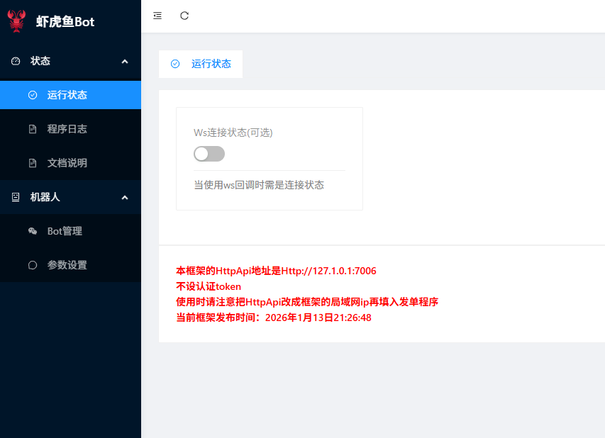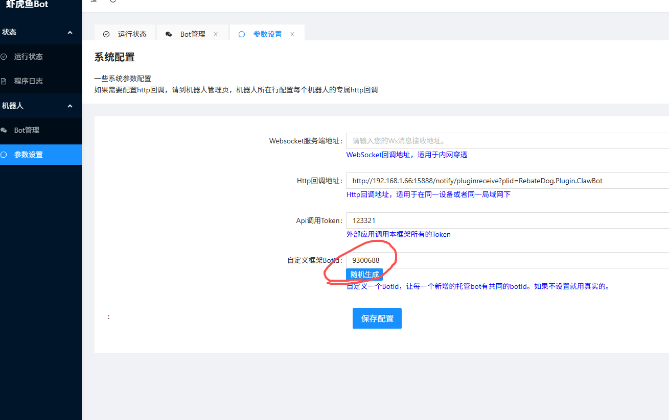 打开ClawBot虾虎鱼后台,点击 系统设置 -> 参数设置:自定义框架BotId:点击“随机生成”并拷贝记录。Api调用Token:自行设置一个 Token(如 123456)并拷贝。