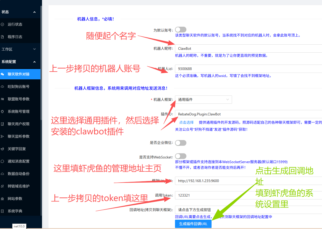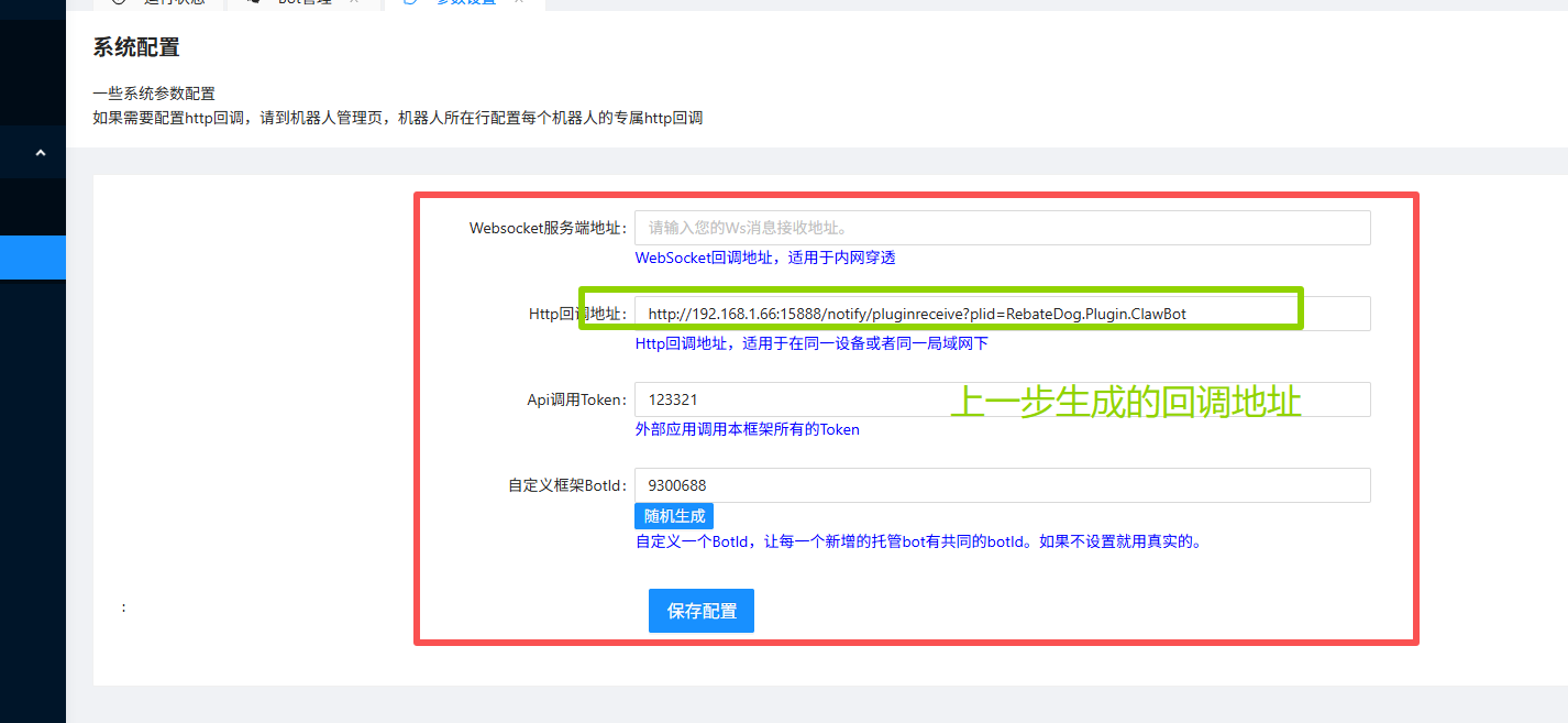 6.将生成的回调地址输入到机器人框架